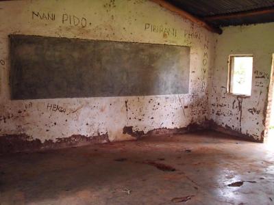 Das soll heißen, dass ich zunächst vorhabe den Raum allgemein abschließbar zu machen, die Wände neu zu verputzen und entsprechend zu streichen, einen abschließbaren Schrank maurern zu lassen, den Boden zu reparieren und kleine Bänke als Sitzmöglichkeiten anfertigen zu lassen. Der letzte Schliff soll dann das an die Wand Malen des Alphabets und der Zahlen bis zehn um die Tafel herum sein...