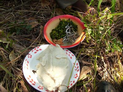 Diese weiße Masse auf dem Foto stellt eben jenes Nsima dar, welches das Grundnahrungsmittel eines Malwiers darstellt. Dies wird zubereitet durch das Aufkochen von Maismehl zu einer breiigen, festen Masse. Nsima wird zumeist mit Rape (Stengelkohl) und/oder Usipa (der kleine abgebildete Fisch) gegessen. Dabei gilt es aber die entsprechende Essweise einzuhalten. Soll heißen-mit der rechten Hand ein kleines Mund- und Fingergerechtes Stück abreißen, zwischen Daumen und Zeige- und Mittelfinger etwas kneten und die Beilage hinzufügen und es sich schließlich schmecken lassen.